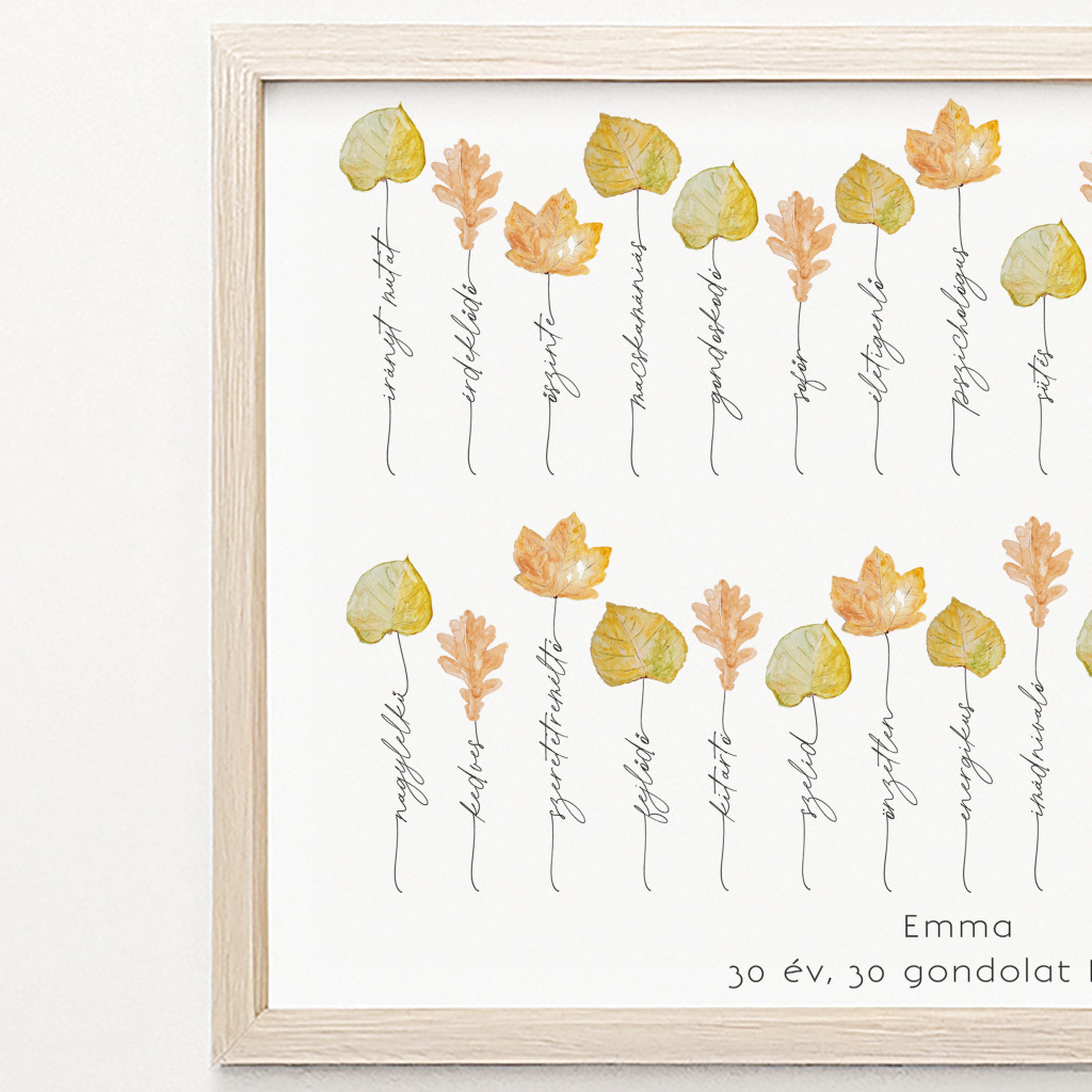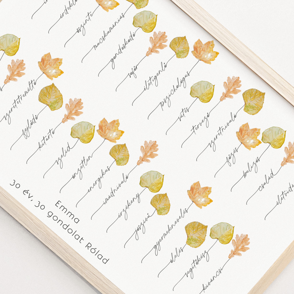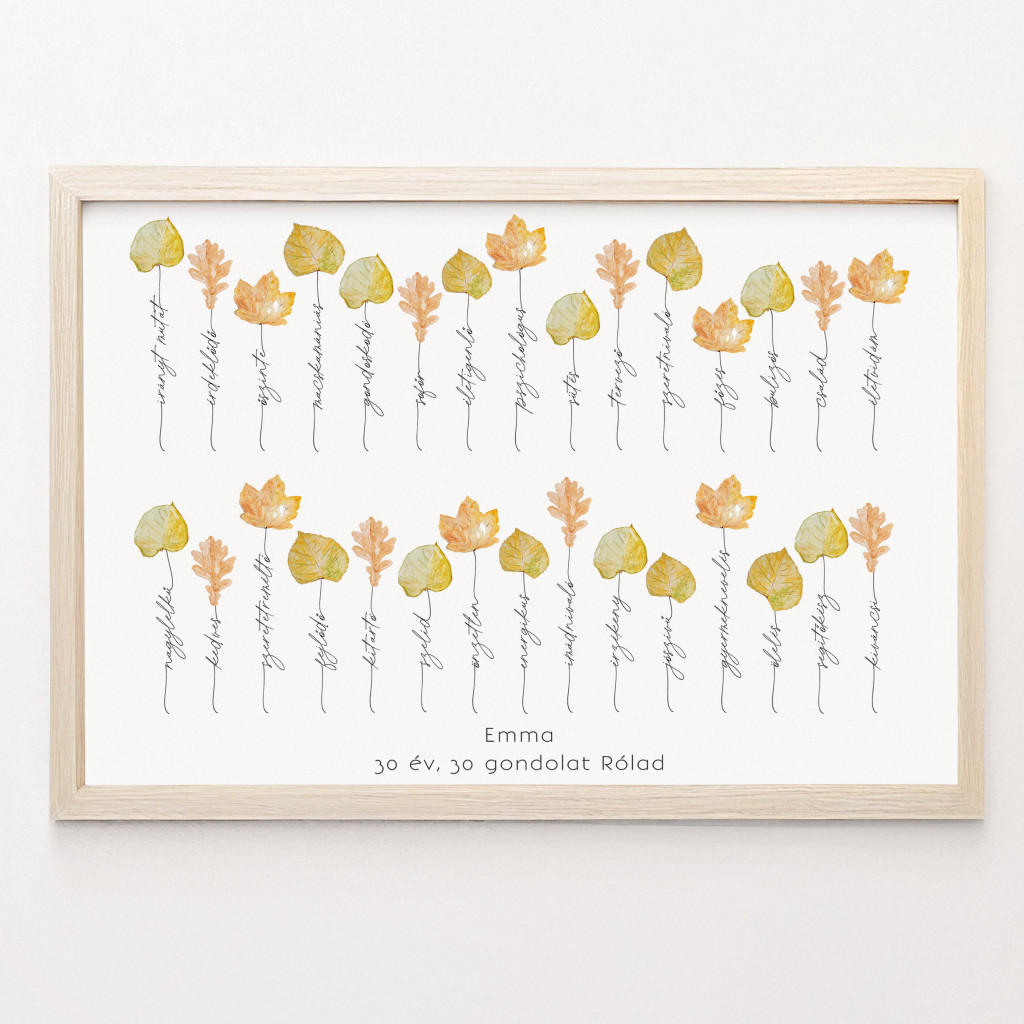 Kerek születésnapra ez a falikép a legszebb meglepetés. 100% meghatottságot eredményez. Ki ne örülne egy olyan ajándéknak, ami teljes mértékben csak róla szól? Ahány év, annyi gondolat jegyében született meg ez a poszter, amin a megajándékozotthoz kapcsolódó emlékek, helyek, dátumok, tulajdonságok szerepelnek. Pont annyi, ahány éves. A letisztult, finom grafikának köszönhetően remek dísze lehet a hálószobának, vagy a nappalinak. Prémium minőségben készül (vastag, időtálló papír és minőségi nyomdafesték), hosszú évekig szép emlék marad. Saját üzenettel, vagy egy kedves idézettel személyre szabható.