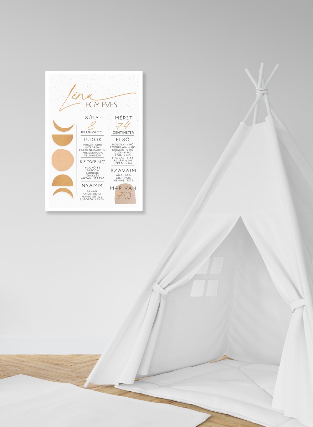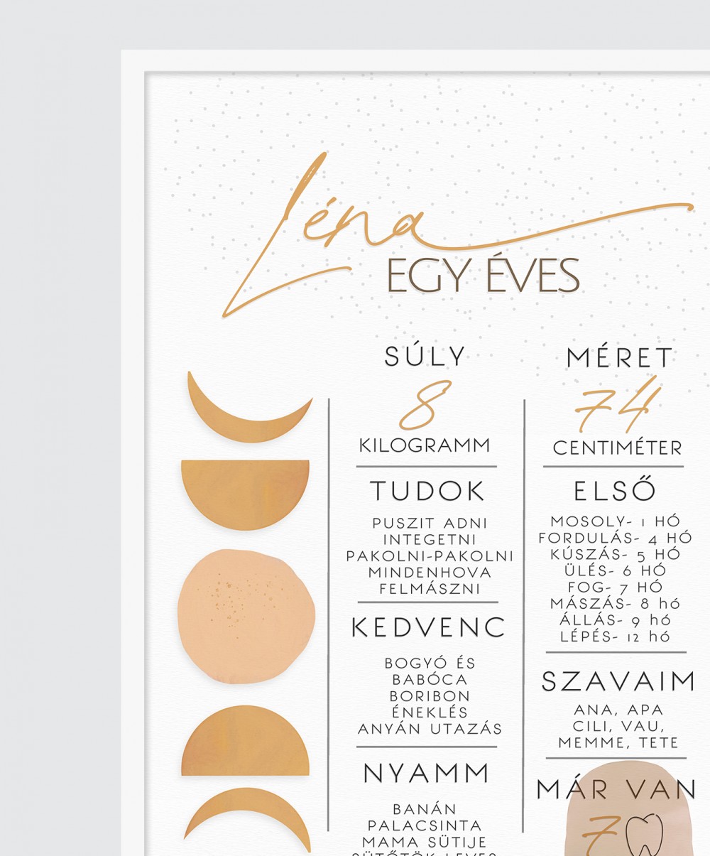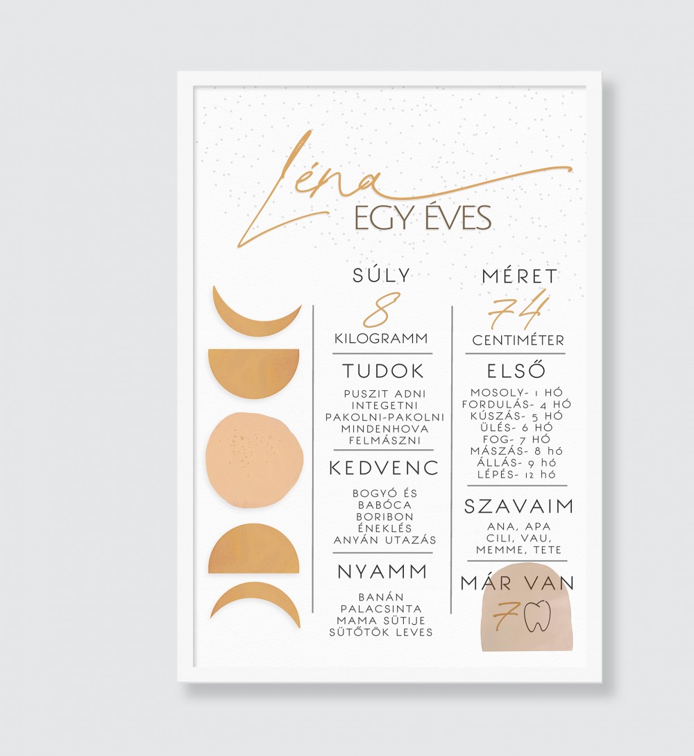 Ez a falikép a kisbabád első évének fontosabb eseményeit összegzi. Egy év, mégis mennyi emlék. Ne hagyd, hogy feledésbe merüljön. Örökítsd meg azt, amire mindig emlékezni szeretnél az első legfontosabb és legszebb évből. Adhatod ajándékba nagymamának, keresztanyának. A meghatottság garantált. A letisztult, finom grafikának köszönhetően remek dísze lehet a gyerekszobának, de akár a nappaliban is megállja a helyét. Prémium minőségének köszönhetően (vastag, időtálló papír és minőségi nyomdafesték) hosszú évekig csodálhatod. Babazsúrt, vagy szülinapi fotózást tervezel? Ez a poszter az első születésnapi fotózások és bababulik remek kiegészítője.